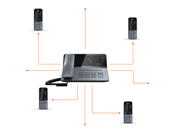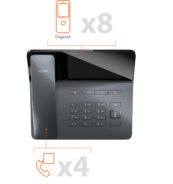 Gigaset Fusion, DECT baz istasyonu olarak çalışırken sekiz adede kadar Gigaset PRO el cihazını bağlamanıza olanak tanır. Bu şekilde, şirketinizin genel çalışma alanını kapsayacak uygulamalarda maksimum esneklik ve sorunsuz bağlantı elde edilir. Bu aynı zamanda, yüksek çağrı hacimlerinin olduğu yoğun zamanlarda bile dört adede kadar paralel aramaya olanak tanımasıyla müşterilerinizin size her zaman ulaşabilmesi gibi büyük bir avantaj sağlar.