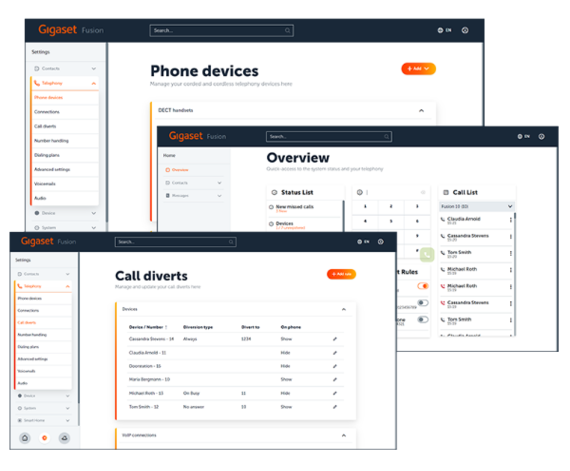 Yeni Gigaset Fusion şimdiden dünyanın en prestijli tasarım ödüllerinden biri olan iF Tasarım Ödülüne sahiptir. Almanya’nın International Forum Design kurumunun odak noktası, estetik ve işlevselliğin trend belirleyici kombinasyonudur ve bu da hepsi bir arada sisteminin sahip olduğu tamamen revize edilmiş telefon ve web kullanıcı arayüzünün gerçek bir dönüm noktası oluşturduğunun altını çizmektedir. Arayüz, herhangi bir internet tarayıcısı üzerinden erişim sağlar ve kolaylık sağlayıcı sihirbazlar, basit menü yapıları ve katlanabilir bölümler sayesinde her zaman sistem genelini örneğin Gigaset Fusion’ın mevcut durumunu, bağlı cihazları, grupları, sesli mesajları, çağrı yönlendirme kurallarını, web aramalarını, çağrı listelerini, harici hatları ve çok daha fazlasını eksiksiz bir şekilde kullanımınıza sunar.