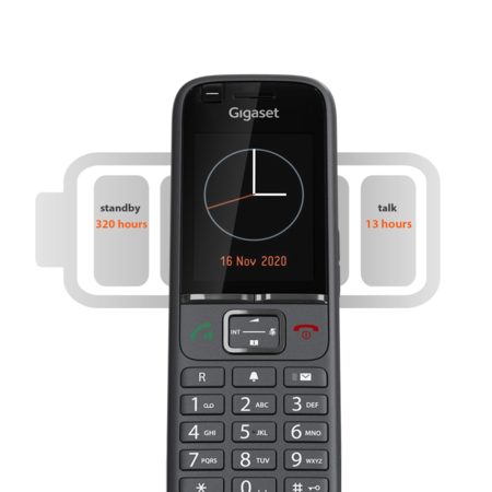 İşler gereğinden biraz daha fazla uzadığında kablosuz telefon basit bir şey olmaktan çıkar: Elde rahatça kullanılır ve üstün ses kalitesi öne çıkan özelliğidir. Uzun bir iş gününün sonunda bile sizi yarı yolda bırakmaz: 13 saate kadar konuşma ve 320 saate kadar bekleme süresiyle son derece dirençlidir. Şarj etme süreleri sizi sıkmayacak kadar kısadır. Cihaz, mikro USB bağlantı noktası aracılılığıyla da pratik bir şekilde şarj edilebilir.